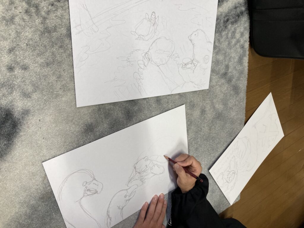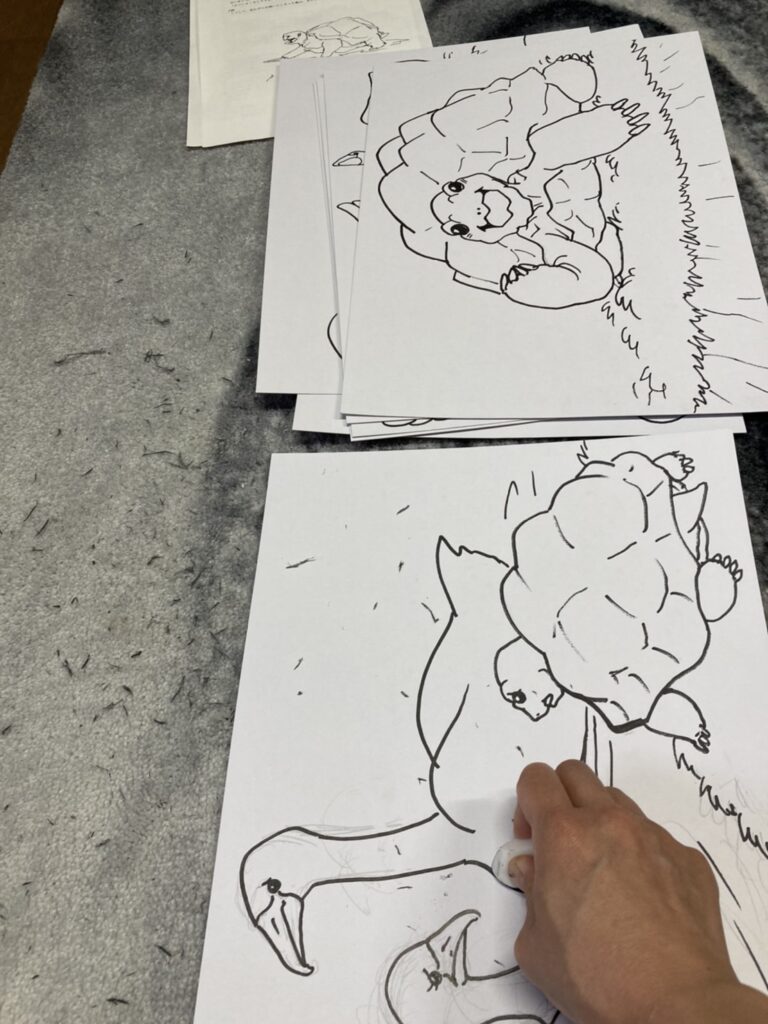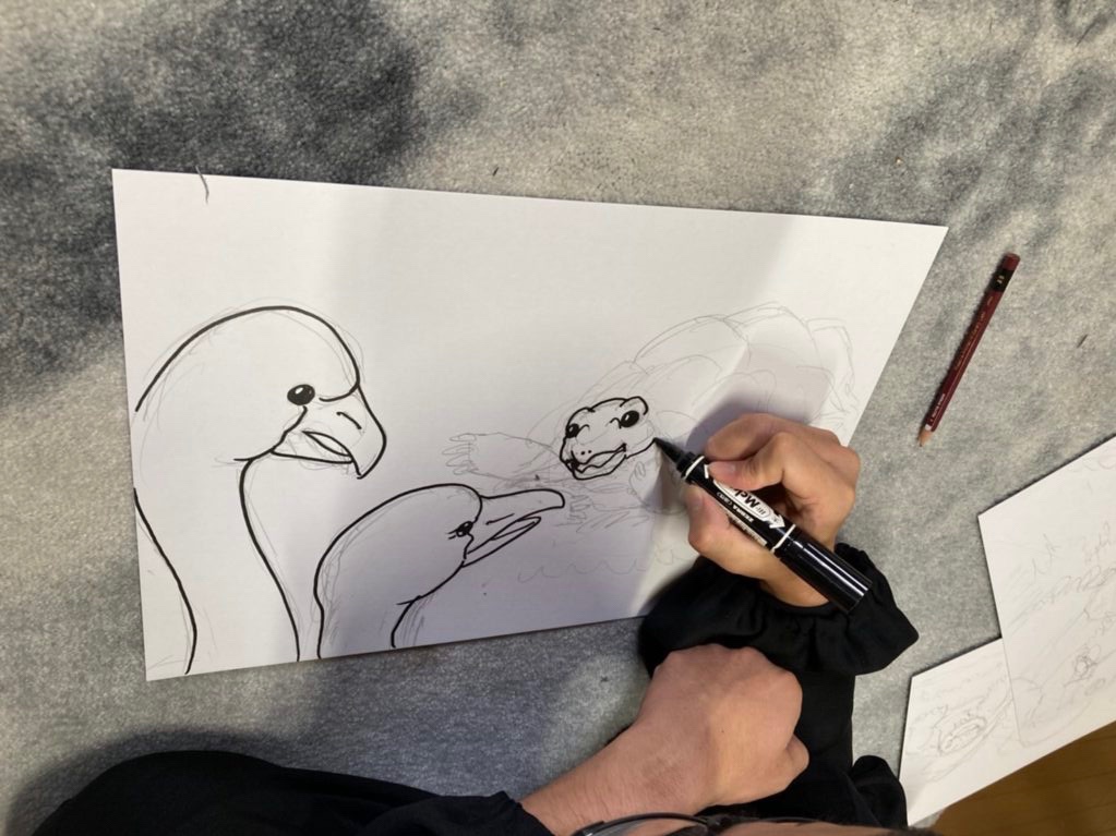 主線はマジックで描きますが、紙芝居によっては、筆ペンを用いたりもします。