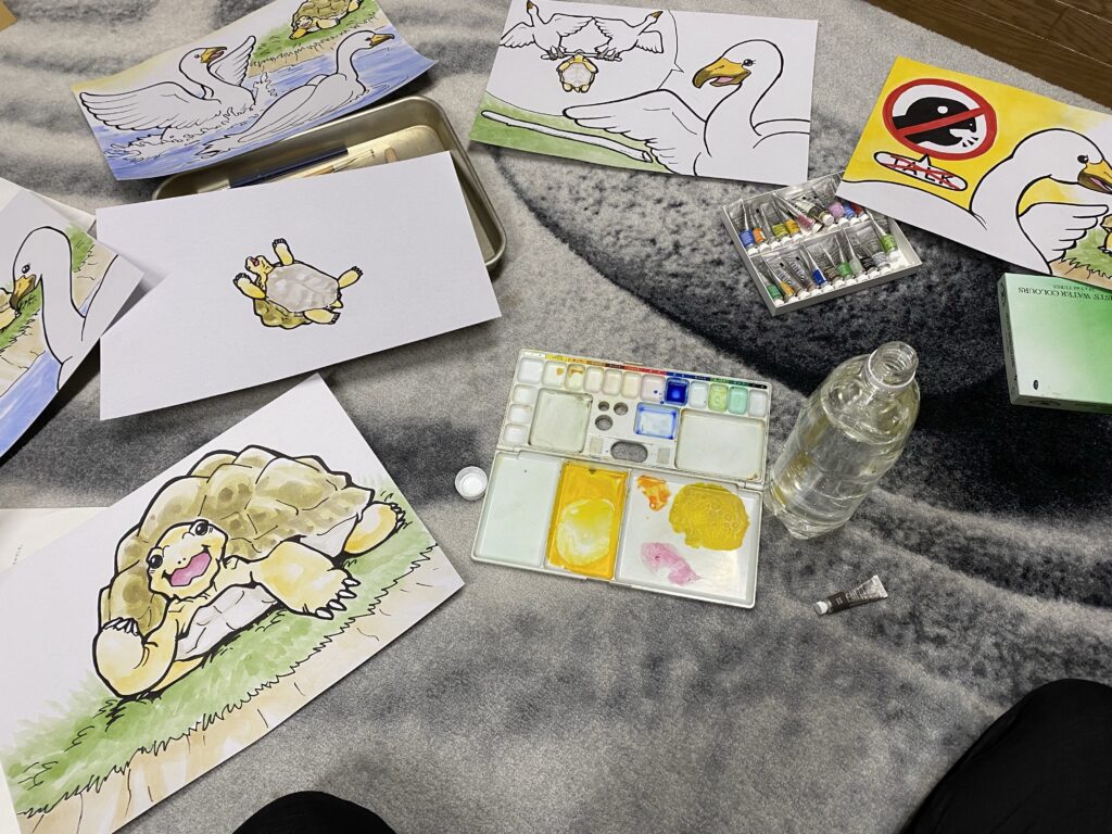 絵の具で彩色していきます。水入れはペットボトルが便利です。