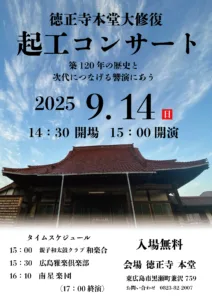徳正寺本堂大修復の工事を始めるにあたり、現本堂最後の行事として、起工コンサートを開催いたします。