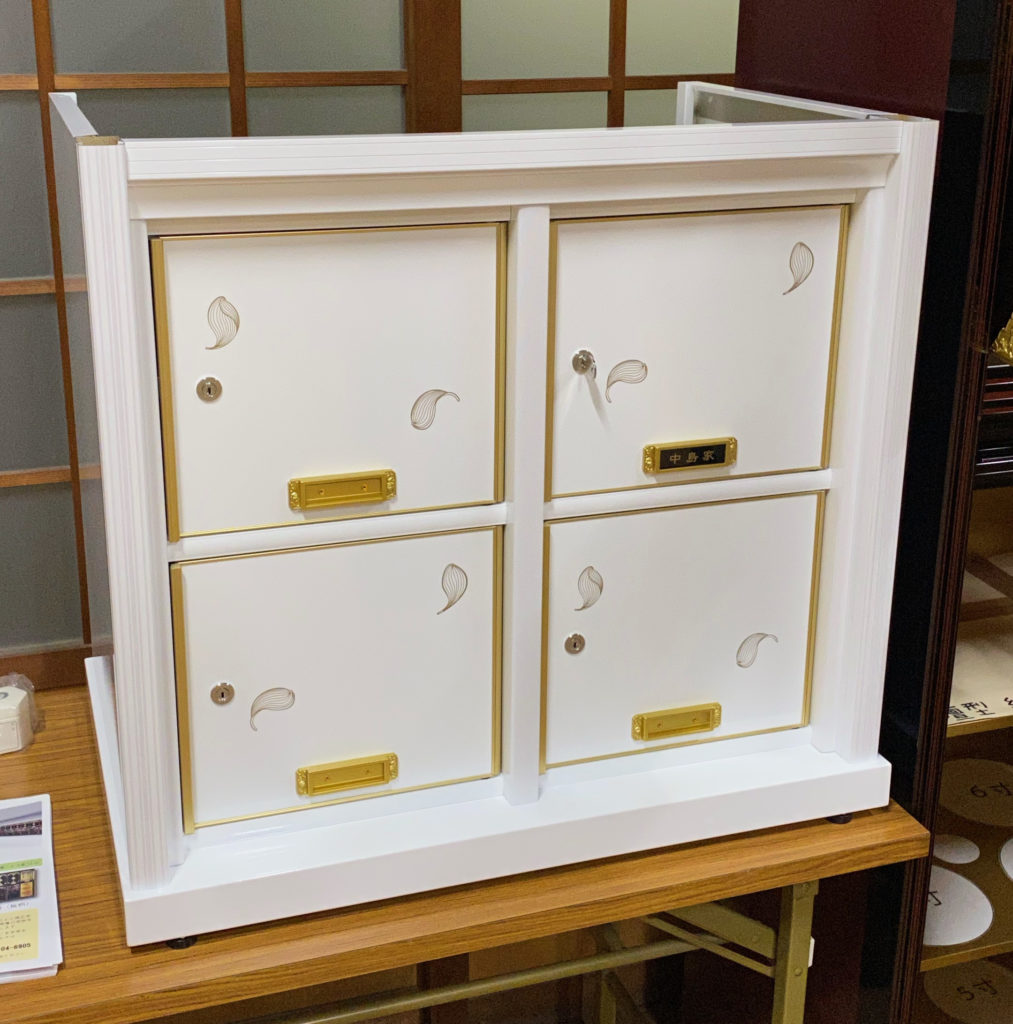 鮮やかな蒔絵が美しい仏壇型納骨壇と、静かに輝くパールホワイトの個別型納骨壇です。