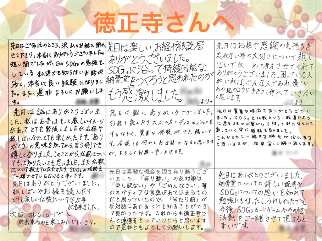 そのSDGsを研究している生徒さんが、徳正寺納骨堂「勝縁廟」の目指すSDGsの取り組みに興味をもってくださり、11月6日に部活動の時間を利用して徳正寺に来てくれました。