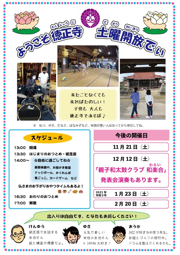 今後も『土曜開放でぃ』の開催日ついては、徳正寺ホームページにてお知らせしていきます。