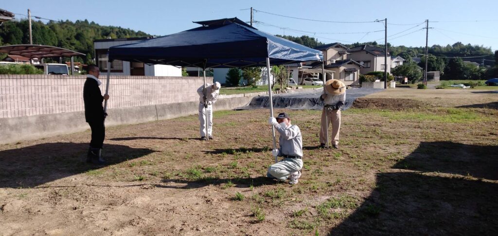 起工式に向けて、敷地の草刈りやテント張りなど、仏教壮年会有志の皆様にご協力をいただきました。