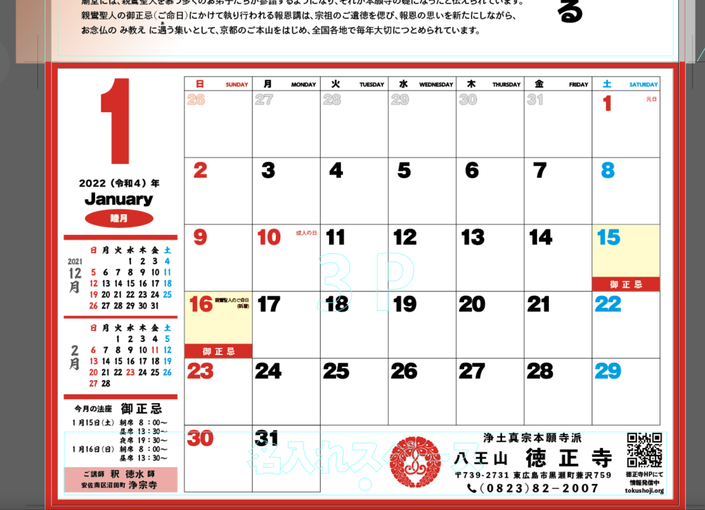 来年2022年用の徳正寺カレンダーを制作しており、10月中旬ごろには完成する予定です。