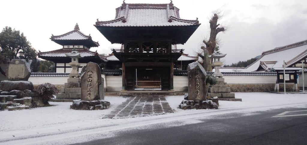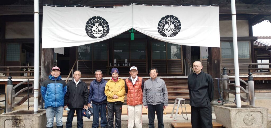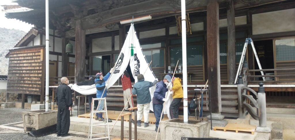 2021年の元旦のように薄っすら雪化粧となった大晦日の朝、仏教壮年会有志の皆さまが集ってくださり、本堂・鐘楼門・庫裡玄関に幔幕を張ってくださいました。