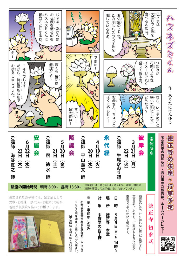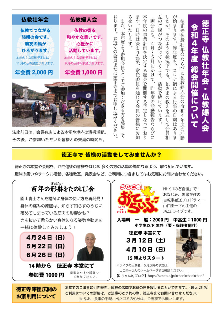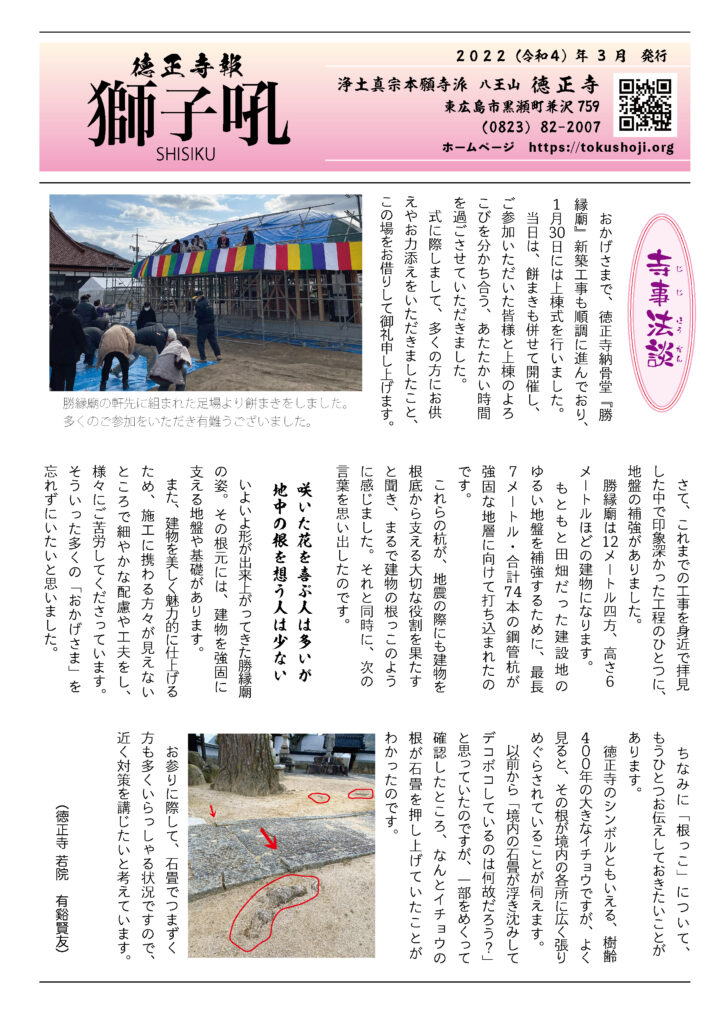 Categories 徳正寺報 獅子吼 徳正寺報 獅子吼 2022年3月号 Post author By 若院 Post date 2022/03/01 徳正寺報 獅子吼 2022年3月号 へのコメントはまだありません Related Tags 寺報, 獅子吼 ← 御紐解法座 休座のお知らせ → 屋根完成 コメントを残す コメントをキャンセルメールアドレスが公開されることはありません。 ※ が付いている欄は必須項目ですコメント ※ 名前 ※ メール ※ サイト Notify me of follow-up comments by email. Notify me of new posts by email. Δ このサイトはスパムを低減するために Akismet を使っています。コメントデータの処理方法の詳細はこちらをご覧ください。