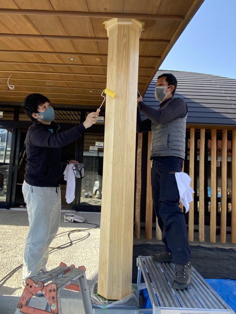 前日、あらかじめ輪染み・アク止め用の塗料で下処理しておいた柱に、お二人がセラミック塗料を塗布していかれます。