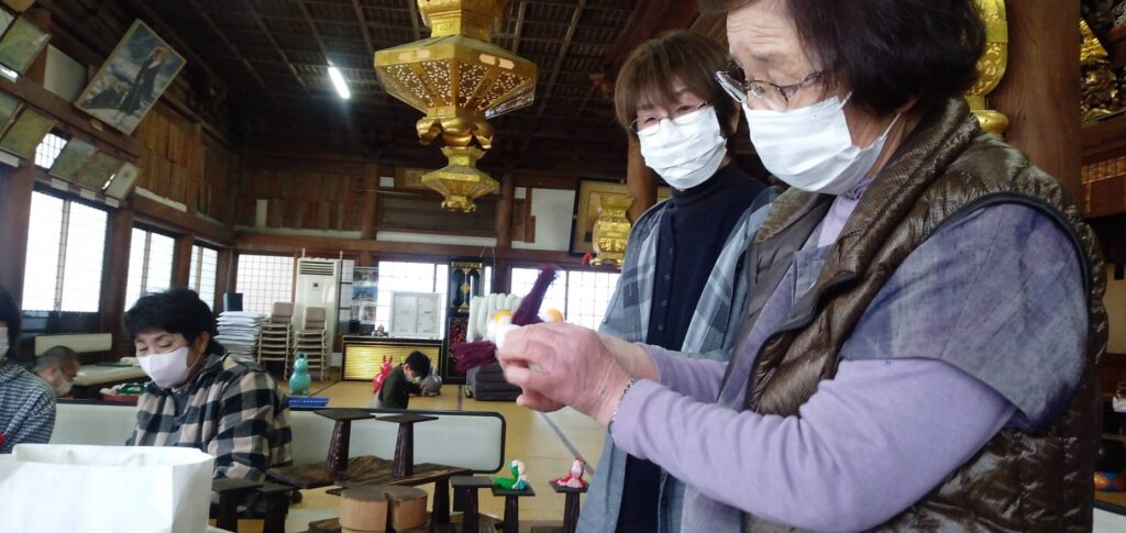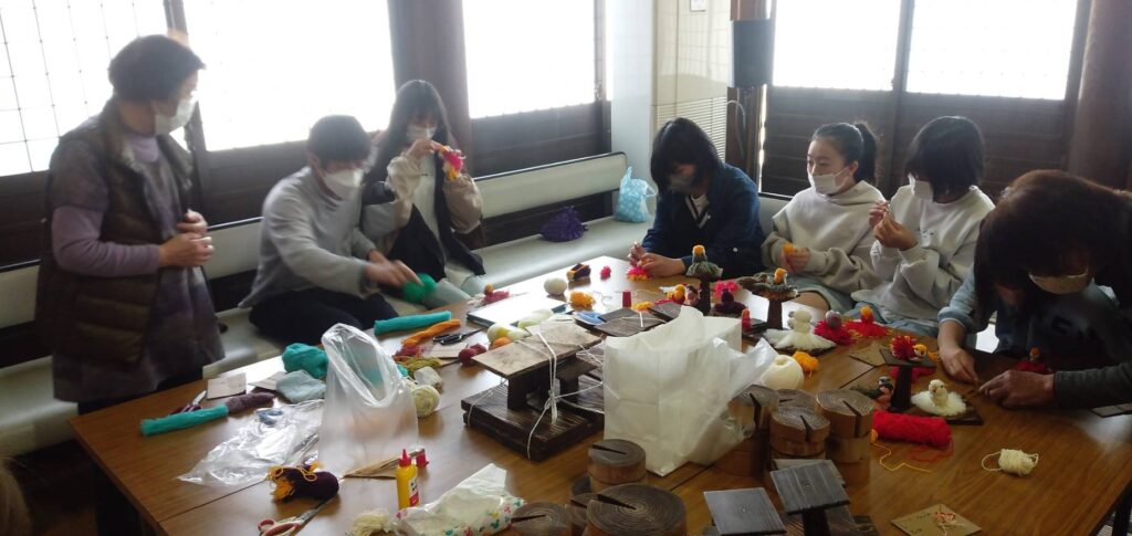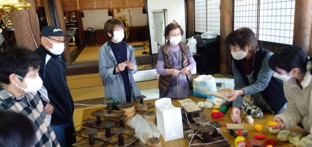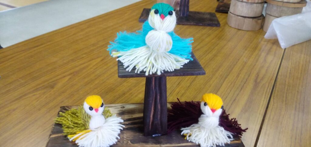 そして、今回の土曜開放でぃでは、ご門徒さんのお力添えをいただいて、毛糸で小鳥を作るワークショップも行いました。