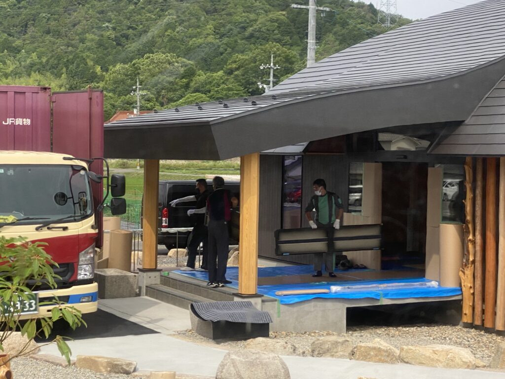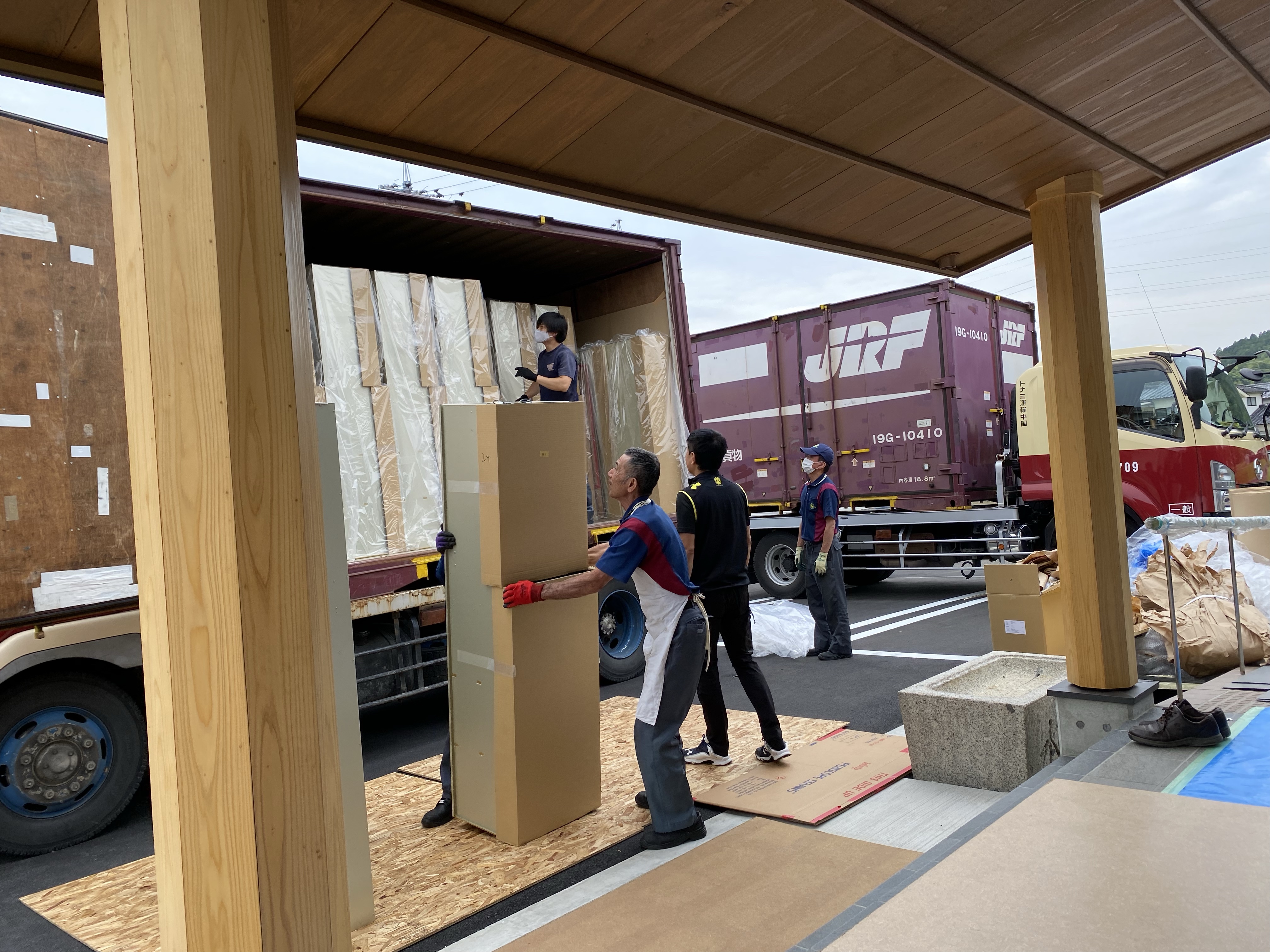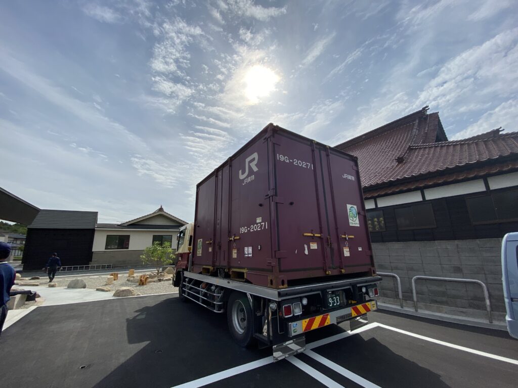 北海道の大岩メタルワークス本社工場で製作された納骨壇が、はるばる、この東広島の地に届けられ、搬入が開始されます。