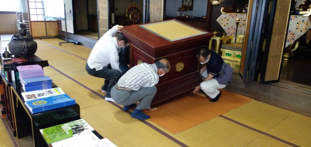 作りがしっかりしており、非常に重たいため、1〜2人ではとても運ぶことができません。総代さんらのお力を借りて、高座を出していただきました。
