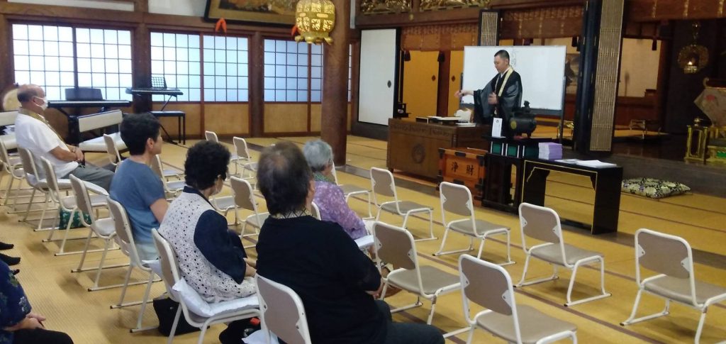 ご講師は、得度奉告・披露に際して、本願寺式務部に勤務されたご経験をもとに、得度式がどのように執り行われるか、儀式に関わる方の心持ちも踏まえてお話くださいました。
