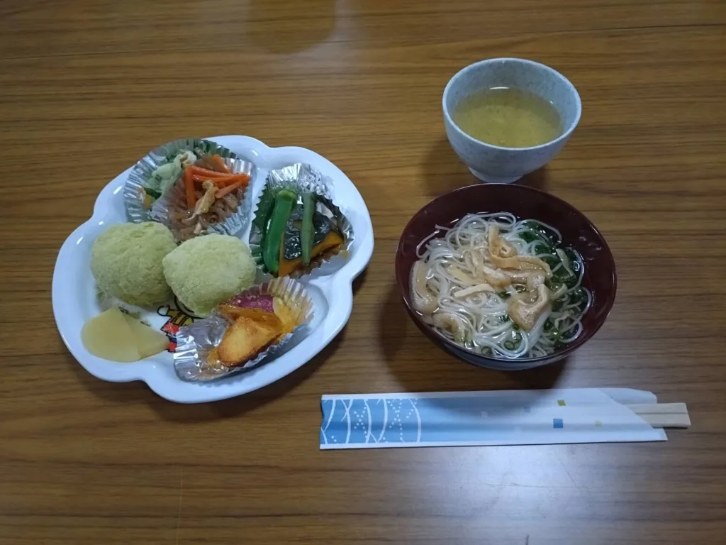 下黒瀬の特徴的な御斎の一品である「丸薬(がんやく)」と呼ばれるきなこむすびと、きんぴら、酢の物、かぼちゃの煮付け、そうめん汁、大学芋。