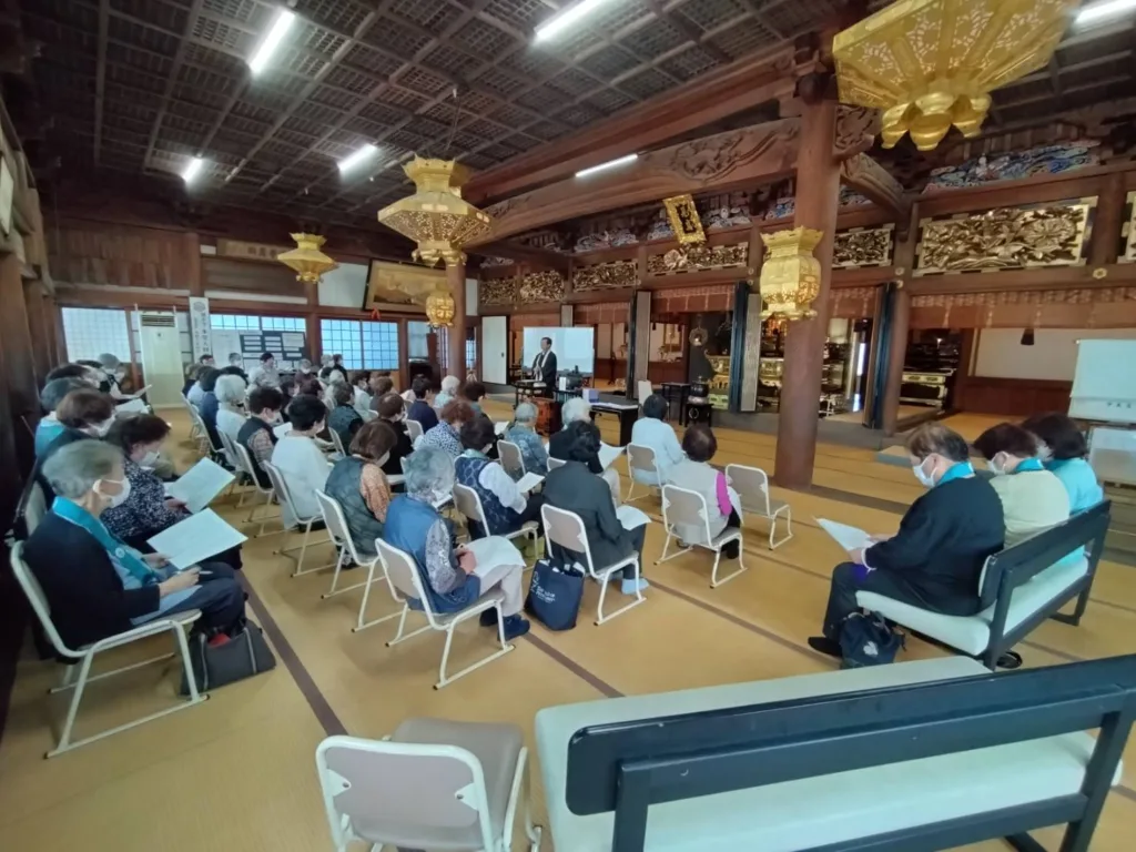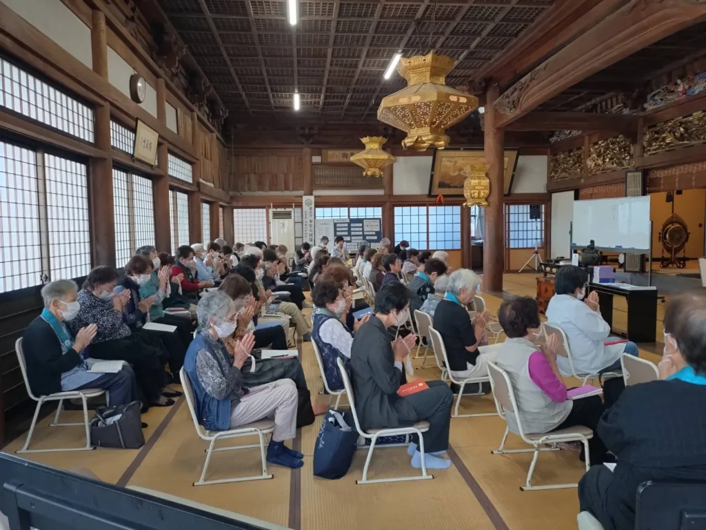 本堂に集われた婦人会の皆さんで正信念仏偈のお勤めを行い、住職が法話。最後に恩徳讃を皆様と唱和いたしましました。