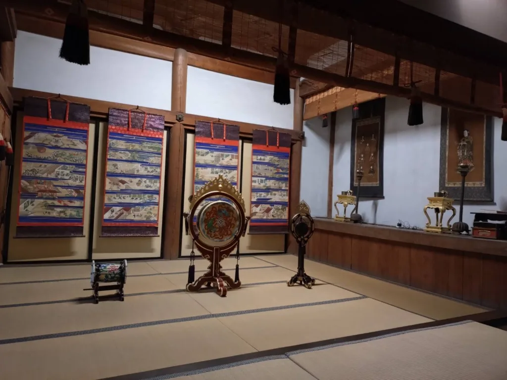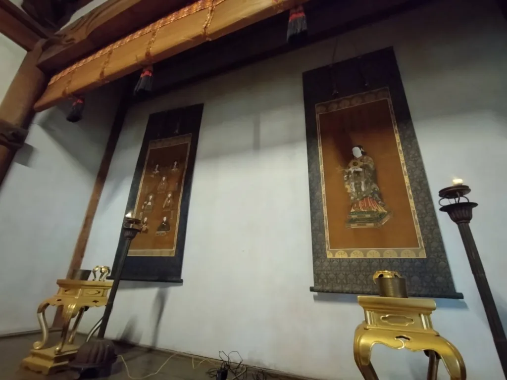 本年は、左余間が雨漏りをしていることもあり、仏具やご絵像を傷めぬよう、御絵伝は右余間の側面にお掛させていただきました。