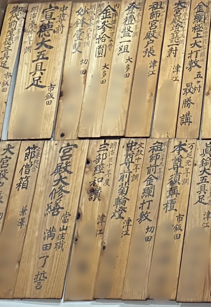 古い記録を紐解く上で、本堂に掲げられていた徳正寺什物寄進に関する木札には、第十一世住職が宮殿大修繕を行った記録と、万延元年に本尊須弥壇が調度されたとの記録が見られていました。