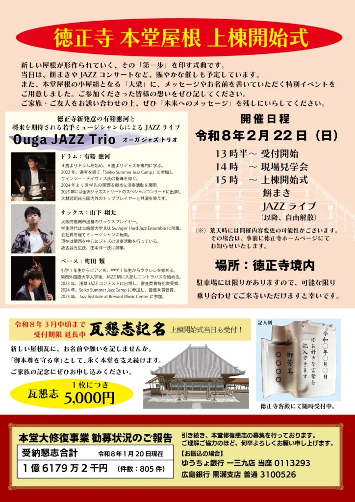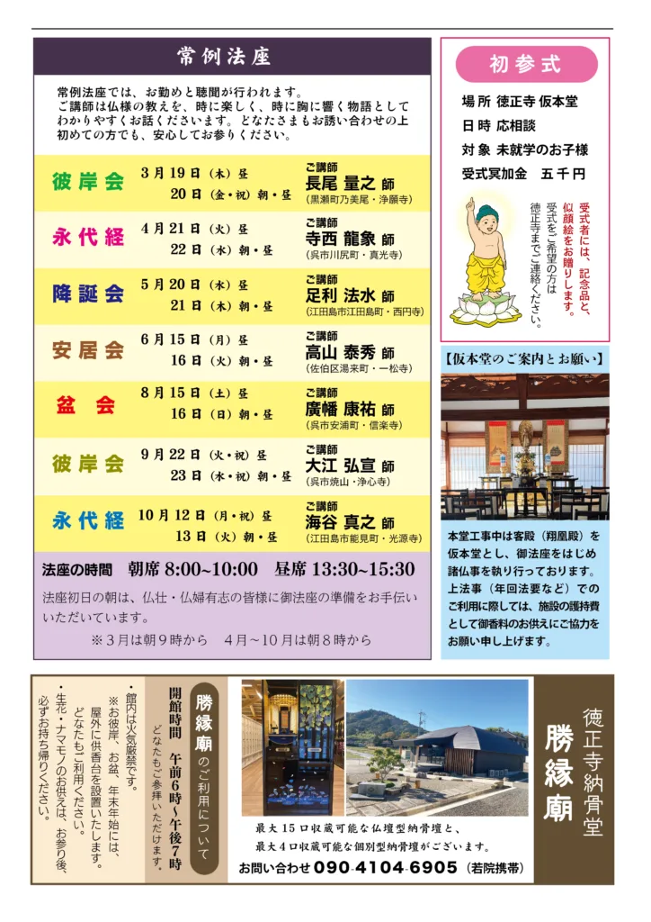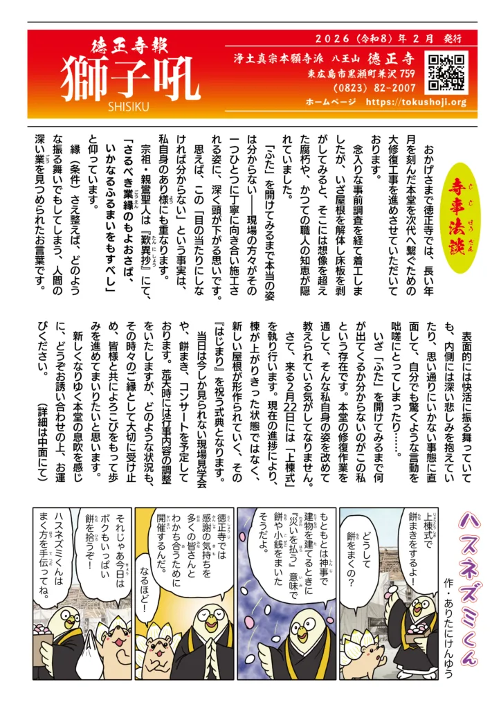 Categories 徳正寺報 獅子吼 徳正寺報 獅子吼 2026年 2月号 Post author By 若院 Post date 2026/01/31 徳正寺報 獅子吼 2026年 2月号 へのコメントはまだありません Related ← 工事報告書(1月) → 上棟開始式のご報告 コメントを残す コメントをキャンセルメールアドレスが公開されることはありません。 ※ が付いている欄は必須項目ですコメント ※ 名前 ※ メール ※ サイト Notify me of follow-up comments by email. Notify me of new posts by email. Δ このサイトはスパムを低減するために Akismet を使っています。コメントデータの処理方法の詳細はこちらをご覧ください。