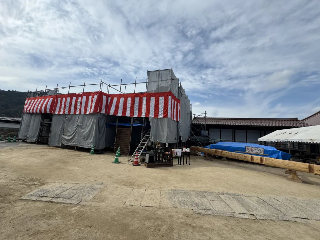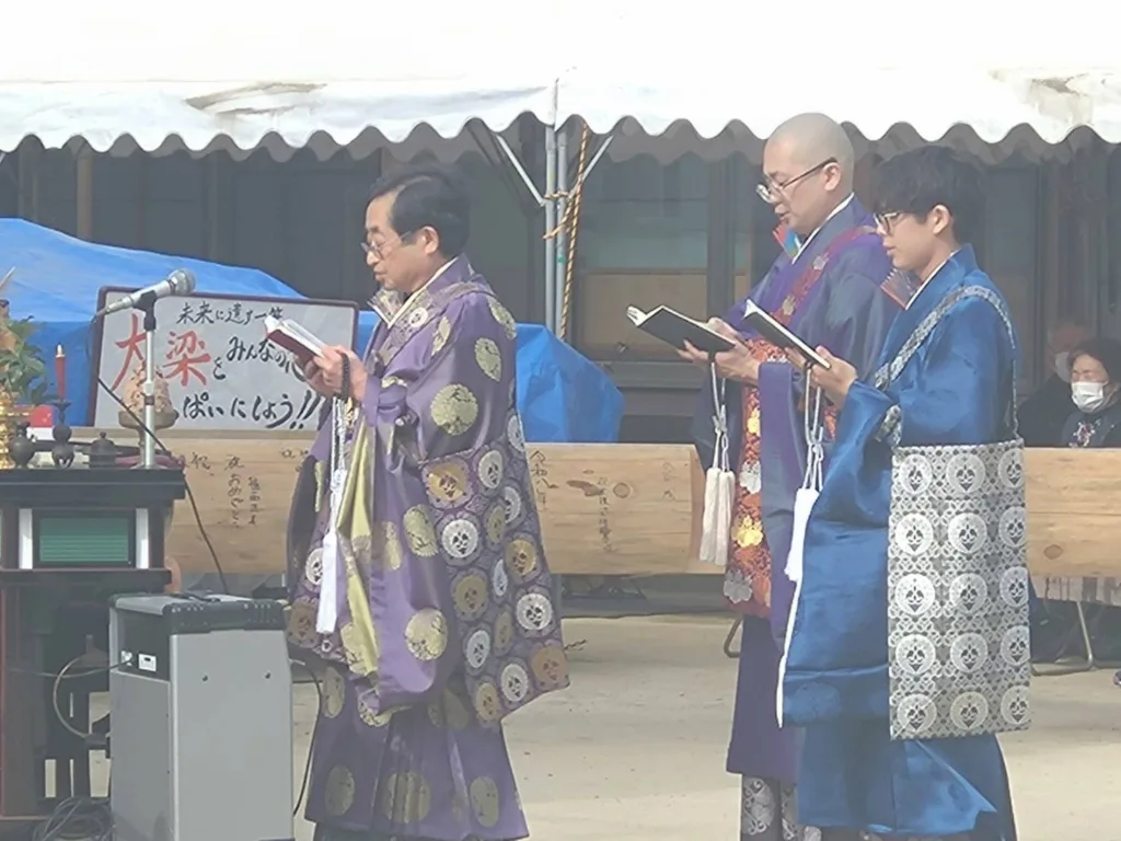 見学会に引き続き、紅白幕が張られた足場の前にご本尊を御安置して荘厳を整え、住職・若院・新発意の3代が揃って上棟開始のお勤めを行いました。