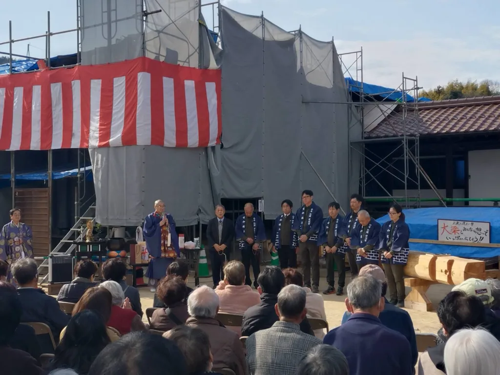 法要には、修復設計を手掛けられた東京堂宮の岡田泰彦代表と、建築工事を担う玄和技工の皆様もお揃いの法被を着用してご列席くださいました。