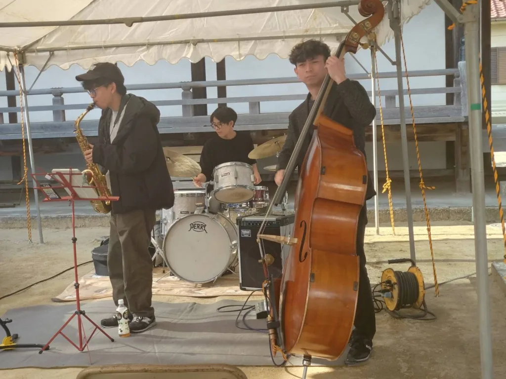 その後は、境内に設けられたテントの下で新発意の應河をはじめ、関西から駆けつけてくれた若手ミュージシャンらによるジャズ演奏の時間。