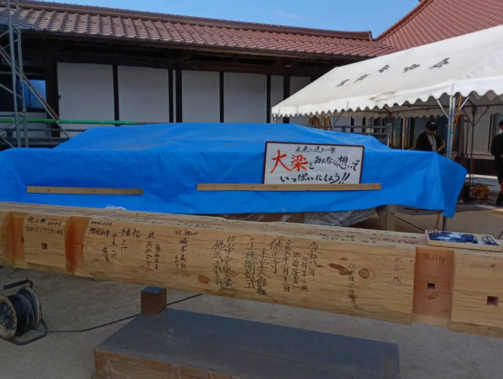 また、境内にはこれから本堂の上部に上げられる「大梁」を設置し、ご参加いただいた皆様に、未来へ残すメッセージや署名を直接書き込んでいただきました。