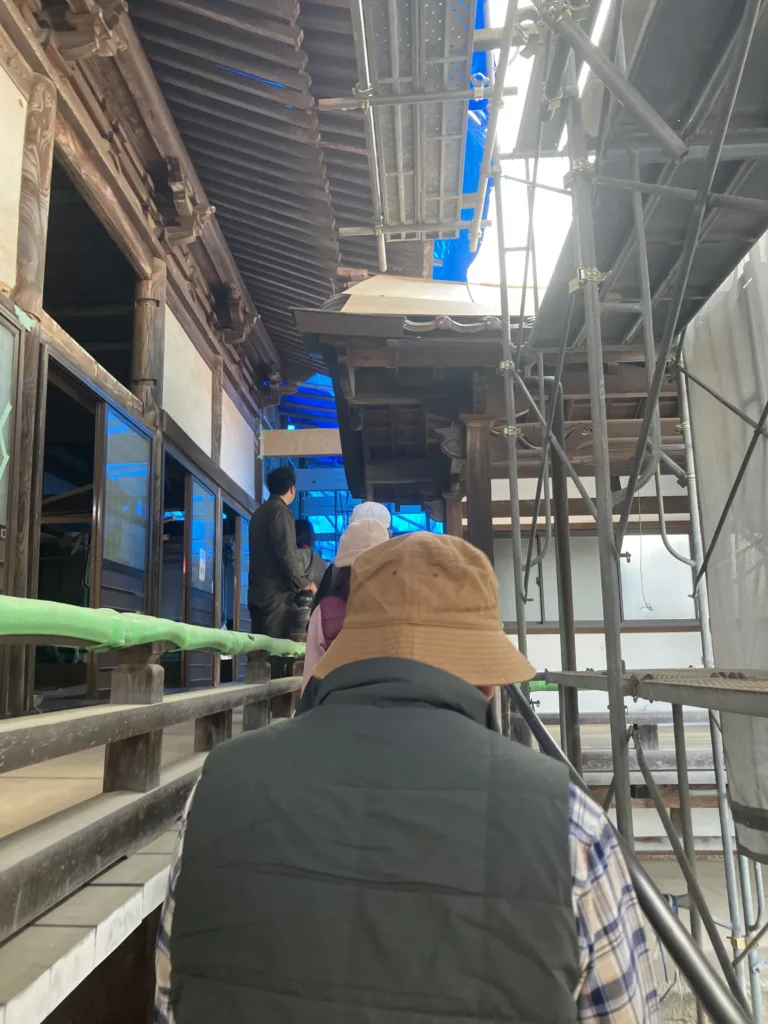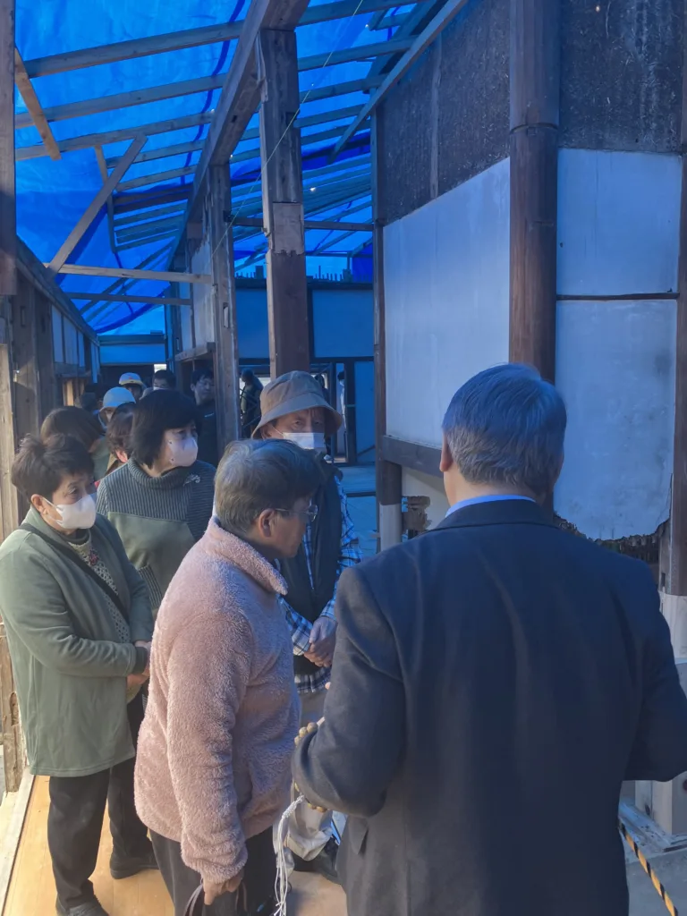 式典に先駆け、ご来場いただいた皆様には修復現場をご見学いただきました。当ホームページでも随時ご報告している工事の進捗状況を、設計の岡田代表や、現場の大工さんらの説明を交えながら直接間近でご覧いただく貴重な機会となりました。