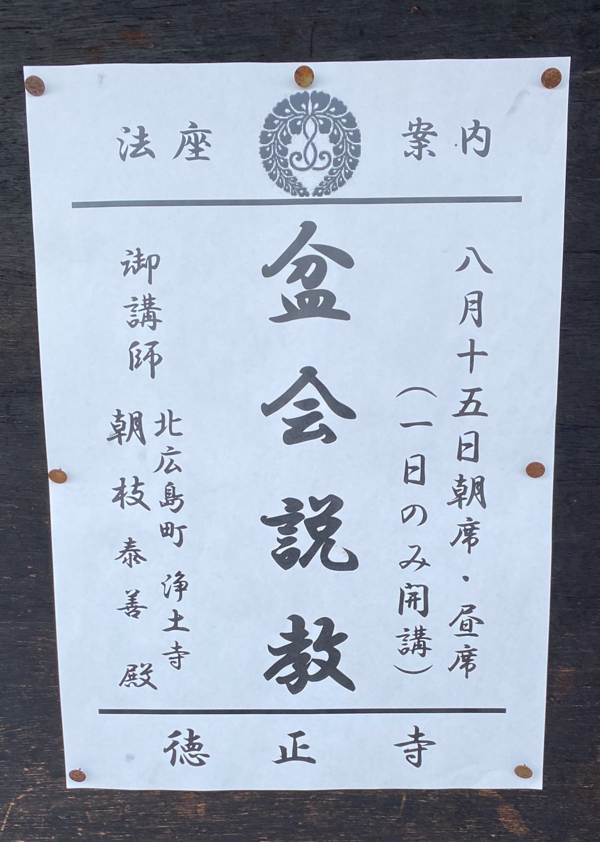 本年の盆会は、8月15日朝席、昼席の2座、1日だけの開講となりました。 「盆会」を浄土真宗では「歓喜会」ともいいます。ご法座を通して、お念仏に出遇う尊さをよろこばせていただきましょう。